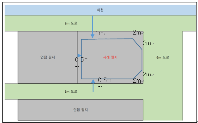 | 남쪽 | 3m 도로 + 인접 필지 | 도로 중심선 기준 0.5m 이격 |