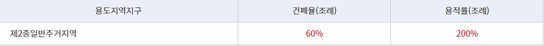예) 제2종 일반주거지역 → 건폐율 60%, 용적률 200%