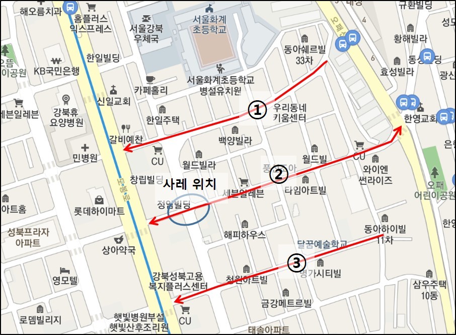 ①, ②, ③동선 중에서 어디가 가장 상권이 활성화되어 있고, 입지가 좋을까요?