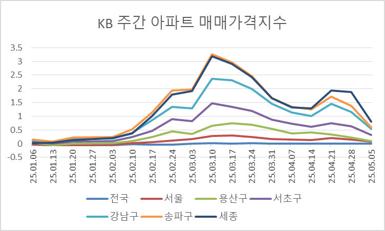 한국부동산원이 발표한 5월 첫째 주 주간 아파트 가격 동향에 따르면,