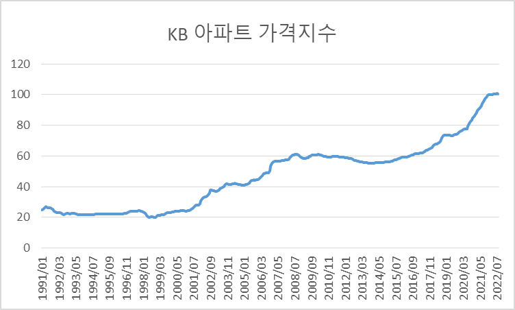 위의 표는 제 직접 제작한 부동산 투자의 대표 격인 서울시 아파트 가격 지수 그래프입니다.
