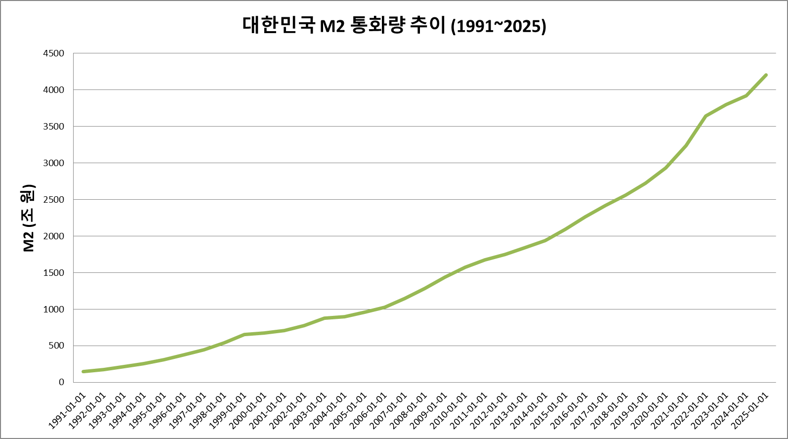 이는 단순한 숫자의 변화가 아니라, 통화량 증가 → 화폐가치 하락 → 실물자산 가격 상승 이라는 흐름을 보여줍니다.