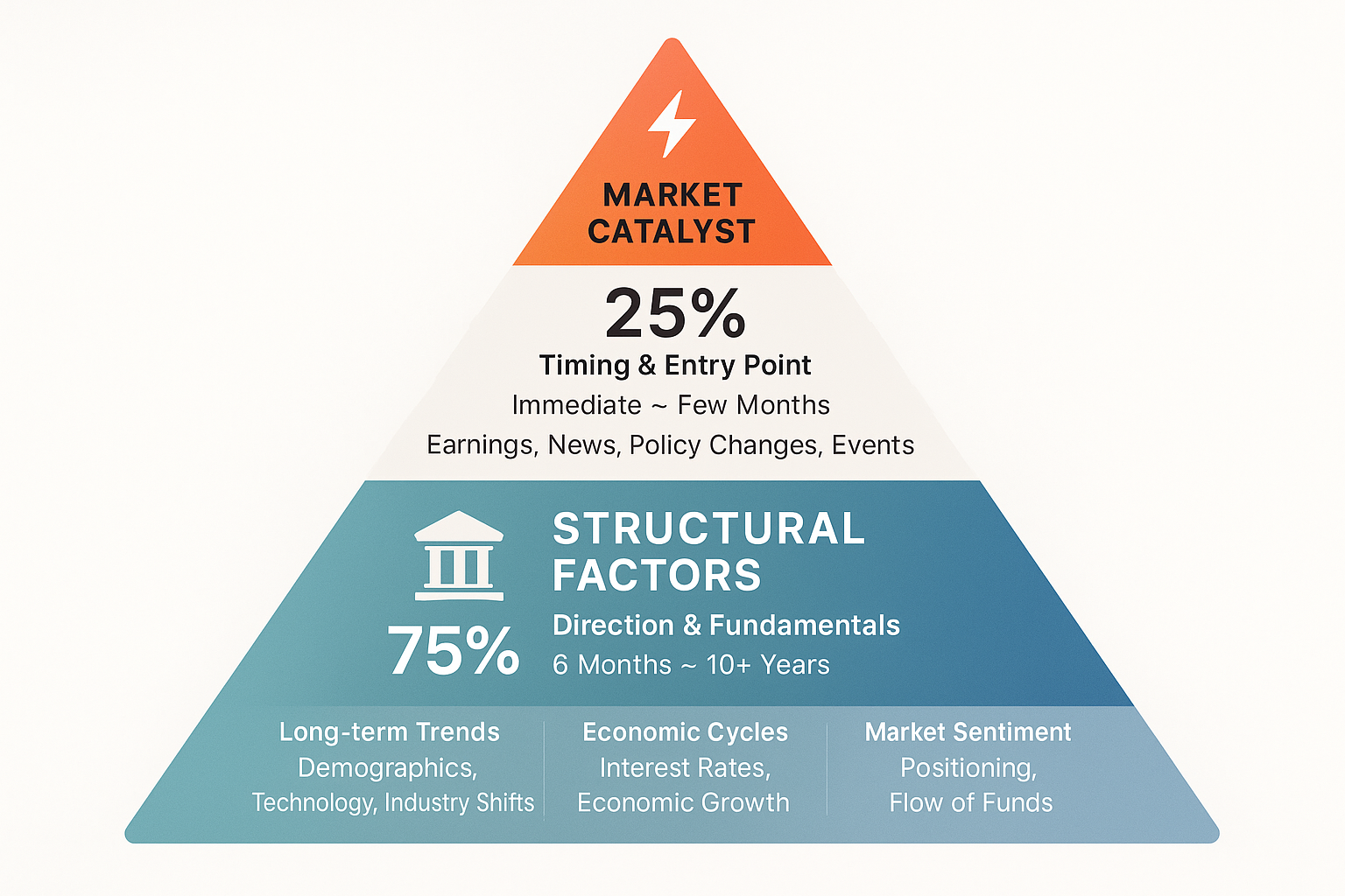 즉 구조적요인(지표를 통한 데이타)은 매수 매도 포지션을 정하고, 시장 촉매(이슈)는 타이밍을 보는것이죠?