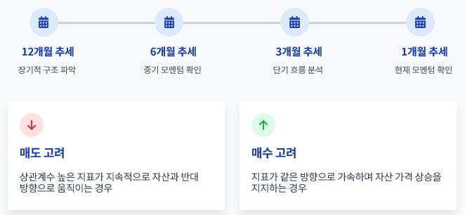 예를 들어 상관계수가 높은 지표가 지속적으로 투자대상과 반대방향으로 움직이고 있다면? 매도 타이밍을 고려해야겠죠?