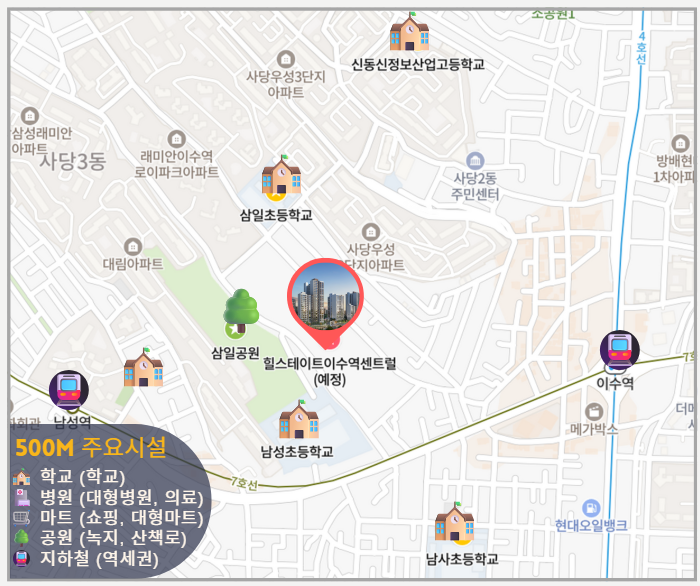 - 교통: 4호선·7호선 이수역 초역세권, 남성역 도보권