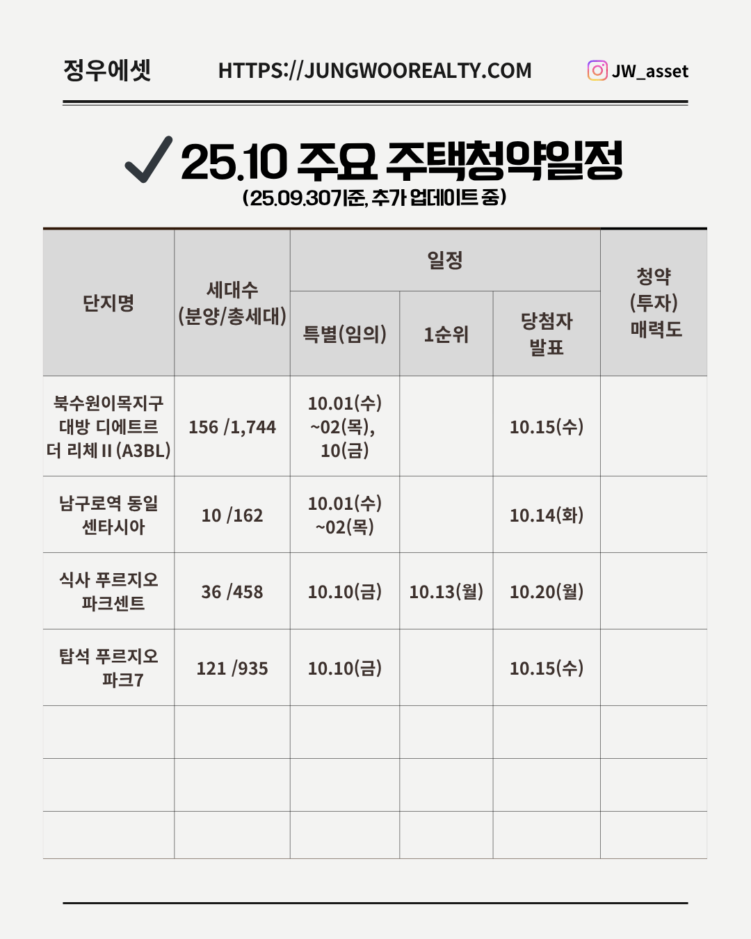 북수원, 남구로, 식사, 탑석 등 수도권 주요 지역 단지들이 포함되어 있어, 청약을 준비하시는 분들께 유용한 정보가 될 수 있습니다.