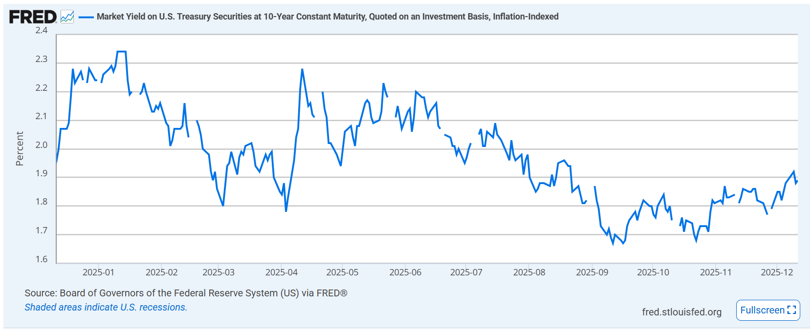 현재는 약 1.89% 수준으로 시장이 실질 성장, 물가 기대를 반영하여 적당히 높은 보상 수준을 형성하고 있다고 보입니다.