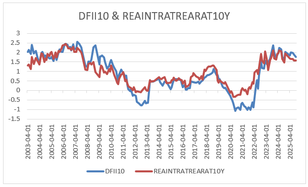 DFII10는 REAINTRATREARAT10Y와 실시간으로 거래되므로, 변동성이 크고 단기 시장심리에 반영합니다.