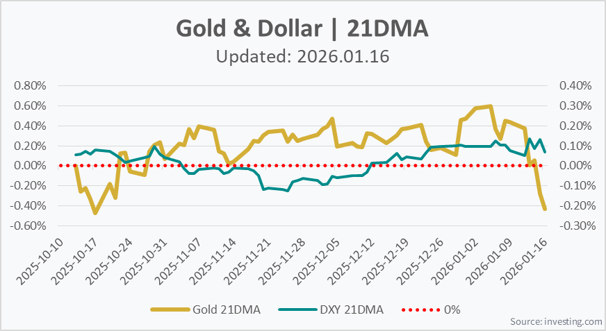 [금 관련] 26.01.16 / 악재 : Reuters, 금값 차익실현과 지정학 리스크 완화로 1% 하락
