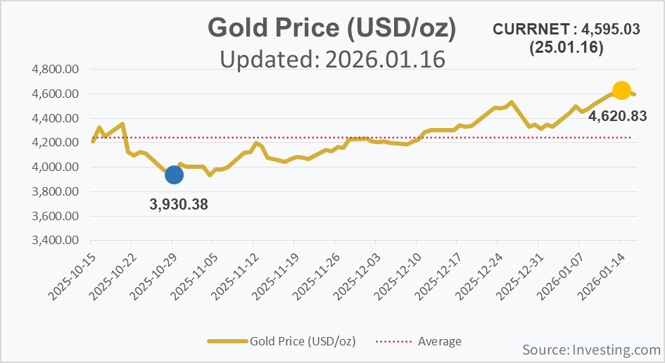 1월12일(월) 트로이온스당 4,594 달러에서 1월 16일(금) 4,595.03 달러로 마무리되었습니다.
